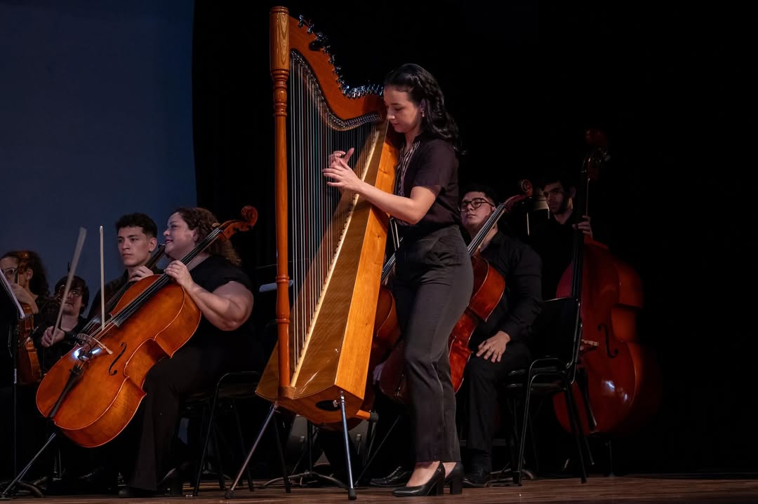 Uno de los momentos más aplaudidos de la noche fue la interpretación de Cascada, con la participación especial de la arpista invitada Dévorah Rolón, estudiante de la FADA, quien deleitó al público con su talento y sensibilidad.